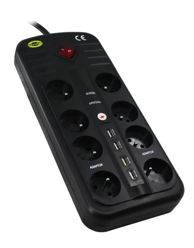 - ORVALDI ORV-8PL 4x USB 2.0: Osiem gniazd z ochroną 3000J i czterema portami USB do szybkiego ładowania.