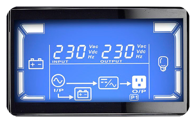 | LCD | Tryb AC, tryb akumulatorowy, poziom obciążenia, poziom naładowania akumulatora, napięcie wejściowe, napięcie wyjściowe, przeciążenie, usterka i niski poziom naładowania akumulatora | ||