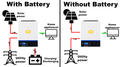 - Z akumulatorem: System przechowuje nadmiar energii słonecznej w podłączonym akumulatorze, który można wykorzystać później, gdy energia słoneczna jest niewystarczająca (np. w nocy lub w pochmurnych warunkach). Obsługuje również ładowanie akumulatora z sieci energetycznej w razie potrzeby, zapewniając nieprzerwane zasilanie urządzeń domowych.